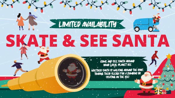 Enjoy a magical skating session where Santa appears around the rink, on the ice, or even riding the Zamboni, bringing festive fun for all ages. Only Available on sessions titled 'Skate & See Santa'.